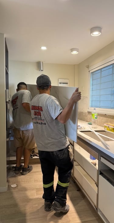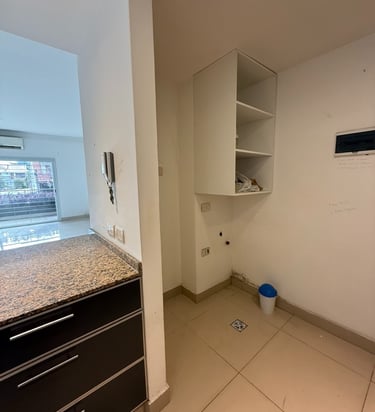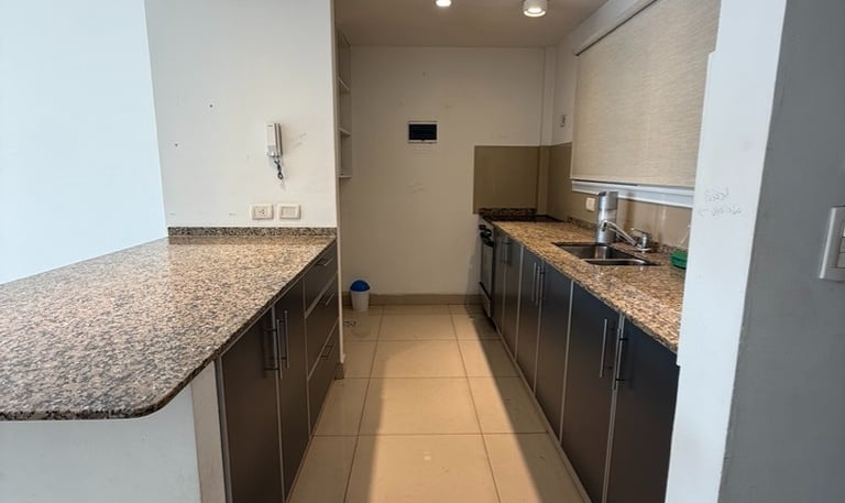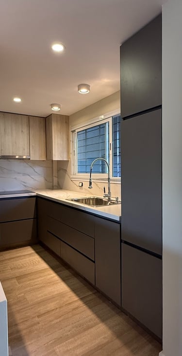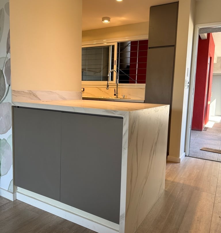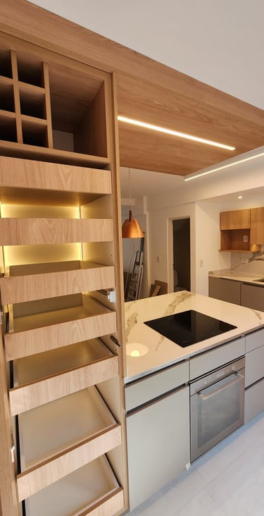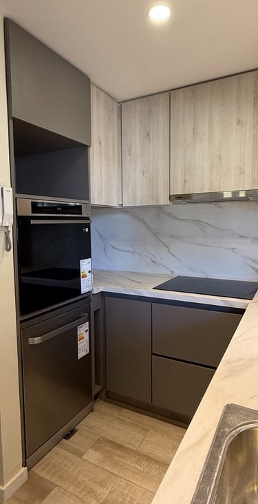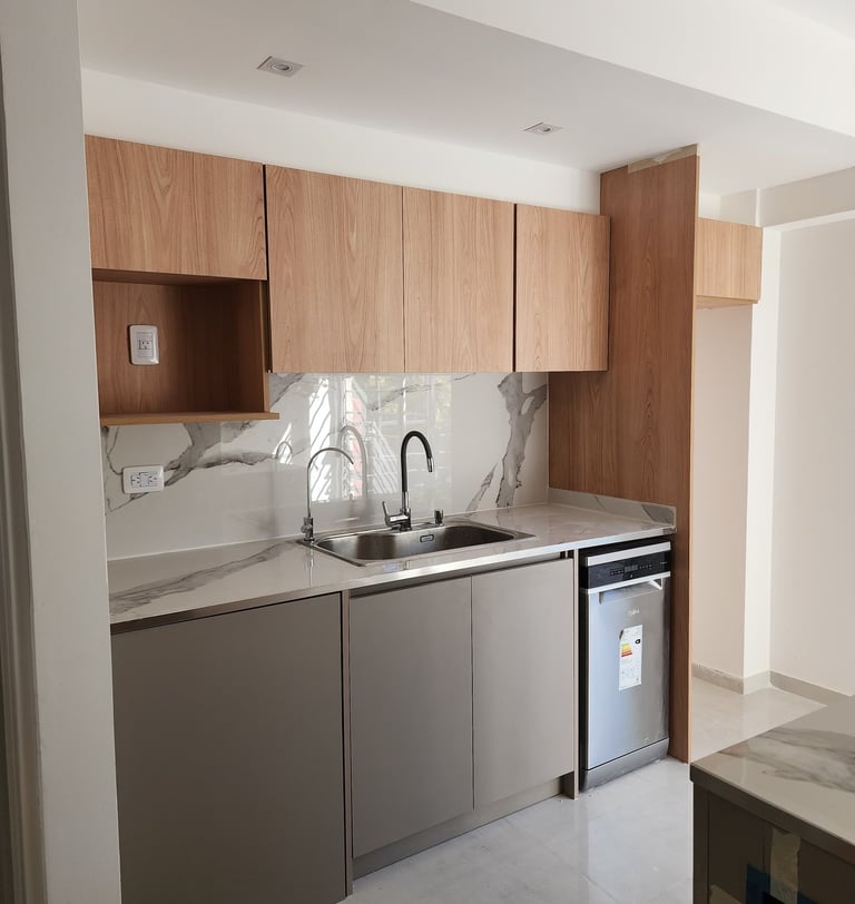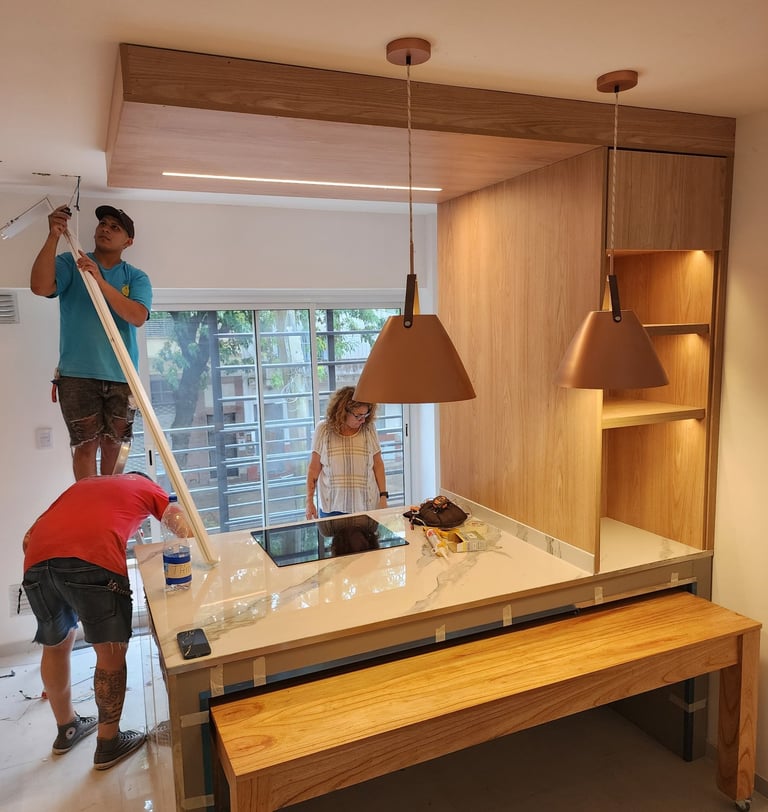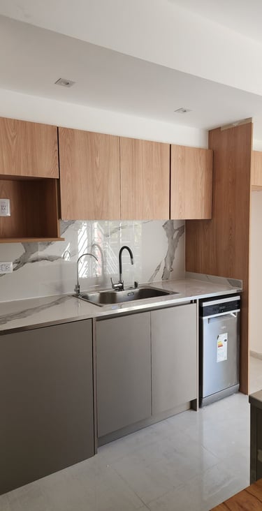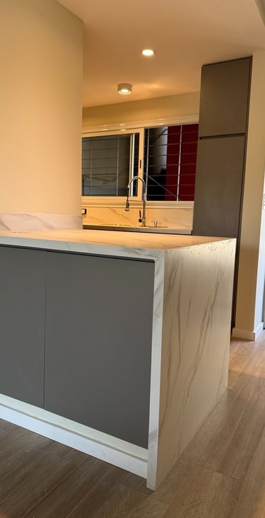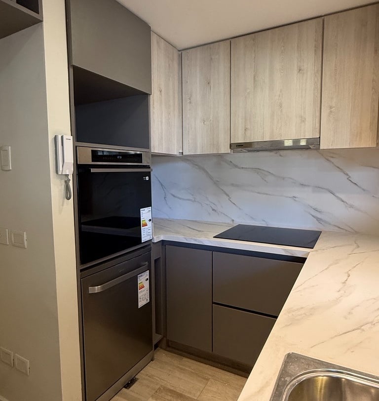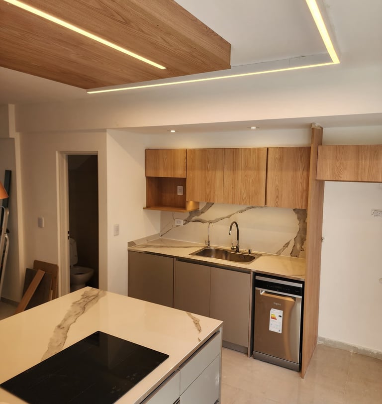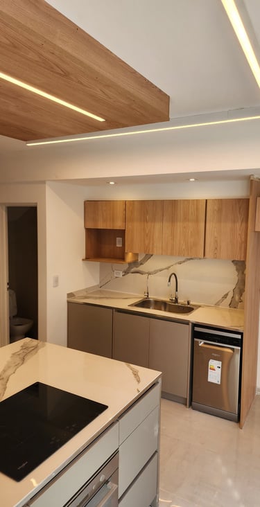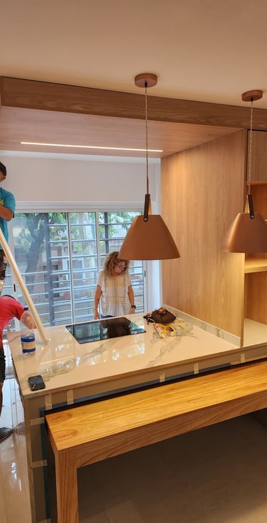 Remodelación de cocina. En este Departamento a estrenar, la familia necesitaba una cocina funcional, completa, con agregado de electrodomésticos modernos, buena iluminación y espacio para recibir gente. El espacio era un ambiente abierto de living, comedor, cocina.