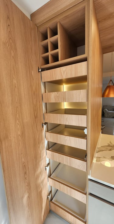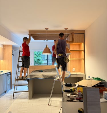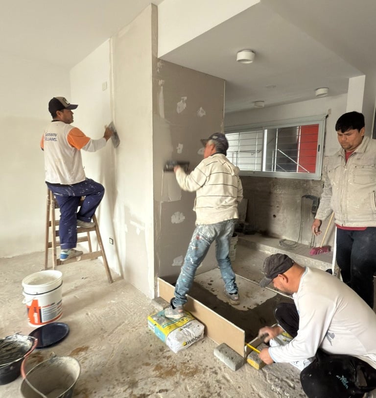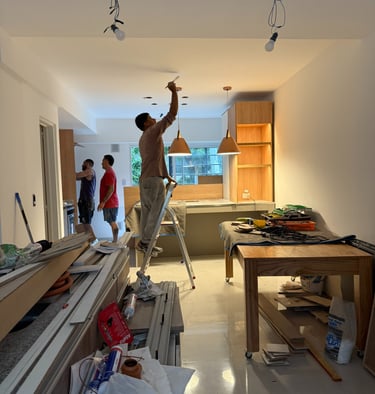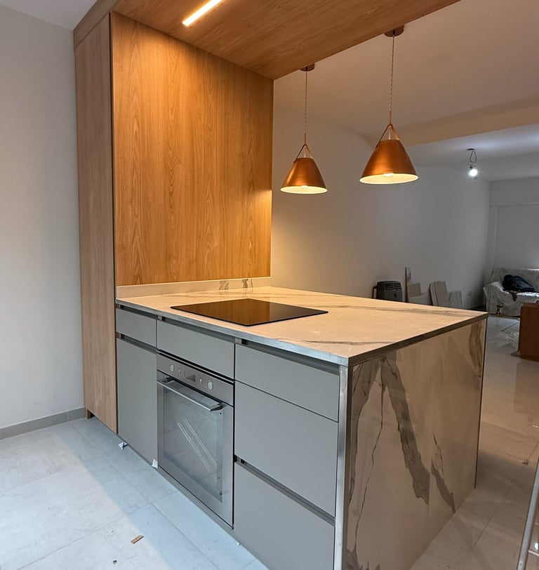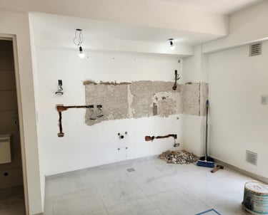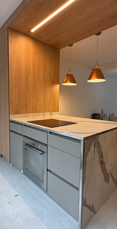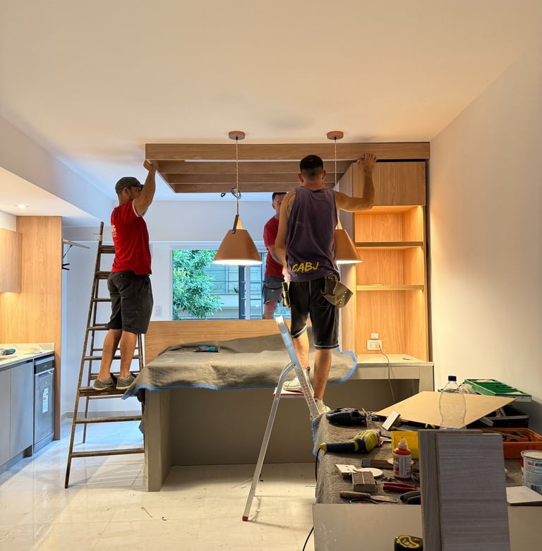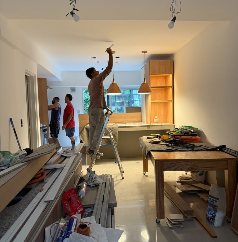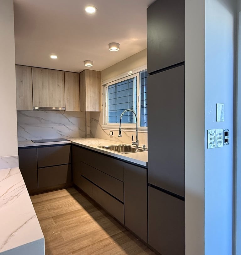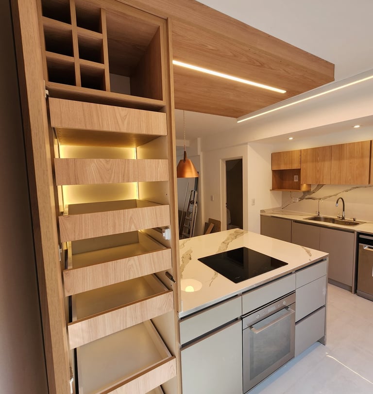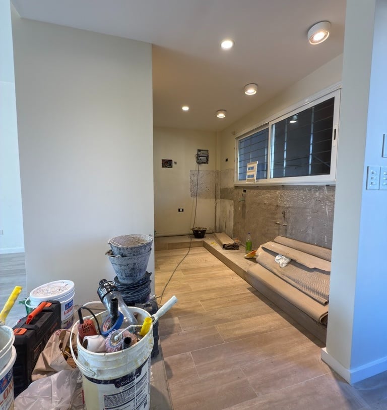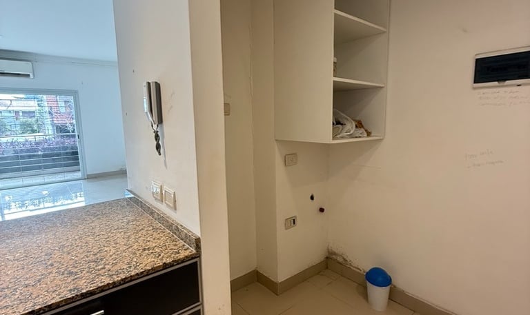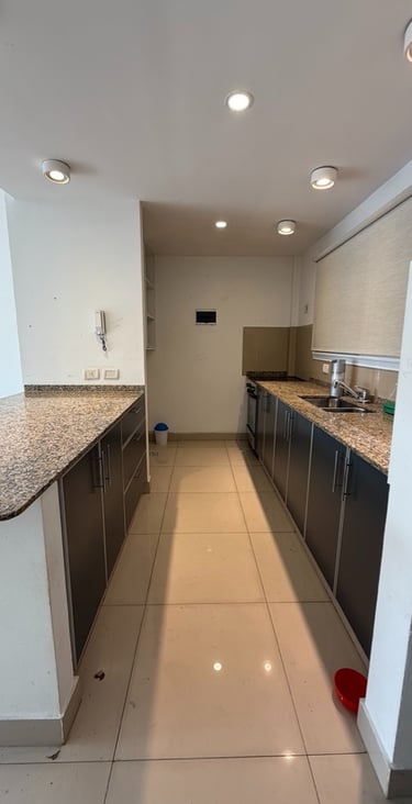 Remodelación de cocina. En este Departamento a estrenar, la familia necesitaba una cocina funcional, completa, con agregado de electrodomésticos modernos, buena iluminación y espacio para recibir gente. El espacio era un ambiente abierto de living, comedor, cocina.